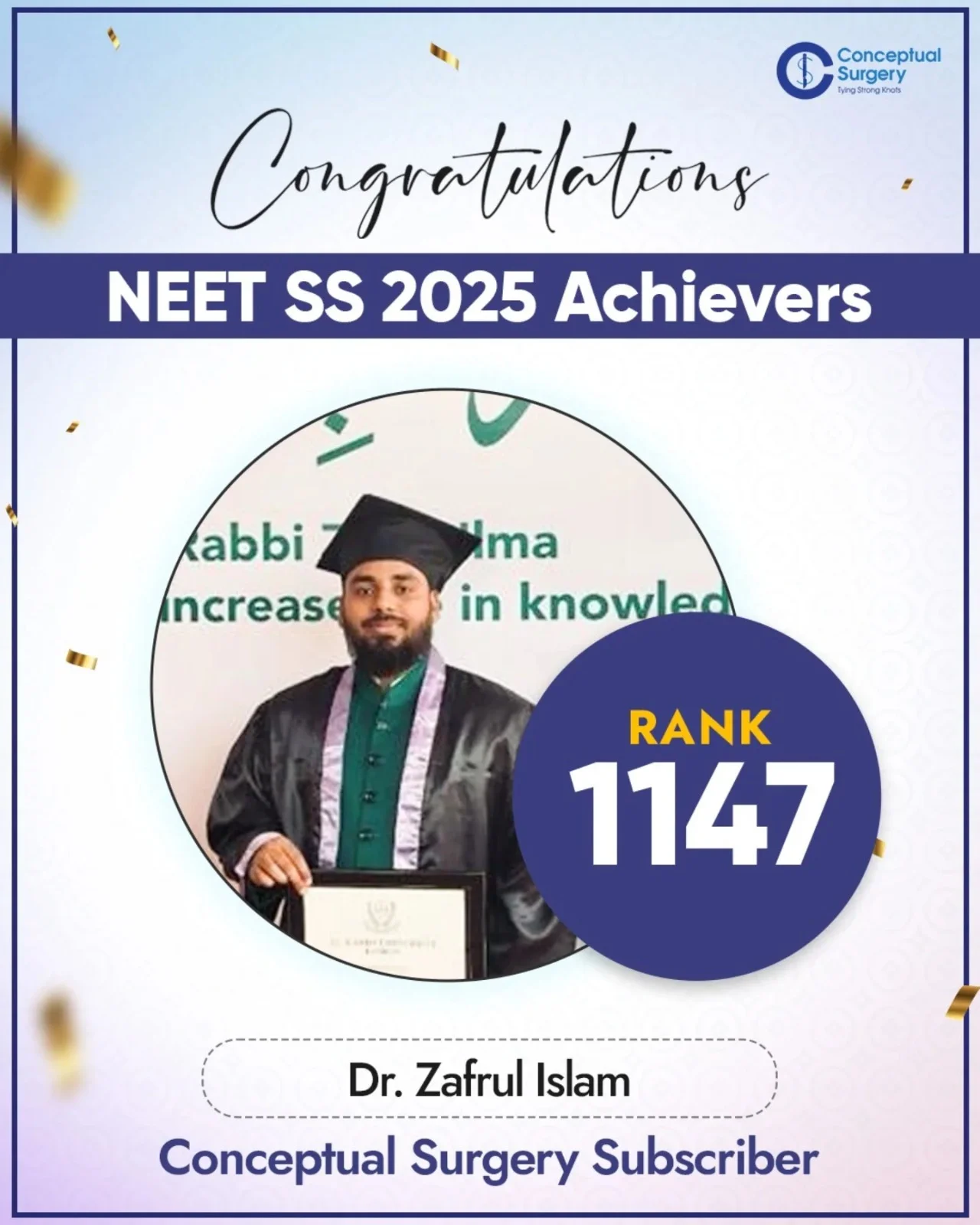 This year’s results celebrate the dedication and strong clinical understanding of our students. Their outstanding performance in NEET SS 2025 reflects the power of concept-driven learning and focused preparation at Conceptual Surgery.